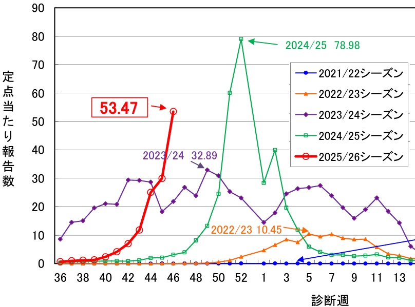 定点当たり患者報告数(あるクリニックが 1週間で診断した新規のインフル陽性者の人数 の平均)が、53.47人にまで増えたんだそうです。