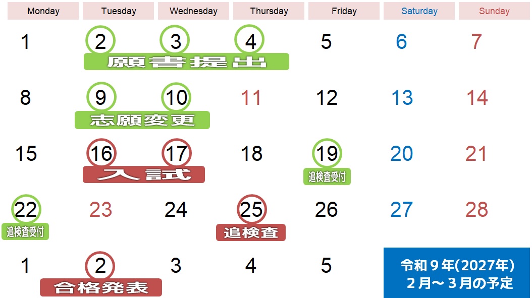 2027年に行われる『令和9年度入試』は、2月16日・17日が本番です。