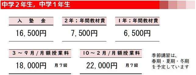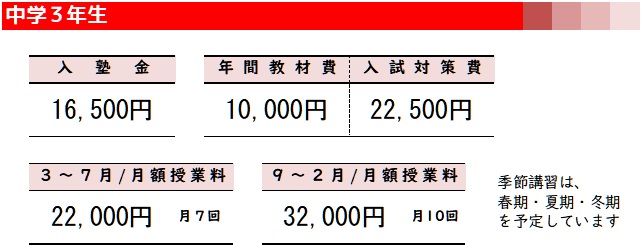 【26年度】諸費用と授業曜日 こんな塾です 2026.01.28 2025年度の各学年の諸費用と授業曜日は以下のとおりです。 諸費用 ※ 入試対策費=塾内模試費4回分+入試対策問題集代 ※ 1・2年生は塾内模試を行いません 授業曜日 ※定期テスト前や受験期には、授業日・授業時間を変更することもあります