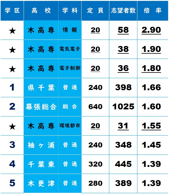 ※公立校の最高倍率は 県船橋の 2.56倍なので、木更津高専情報工学科が県内国公立のトップに立ってしまいました