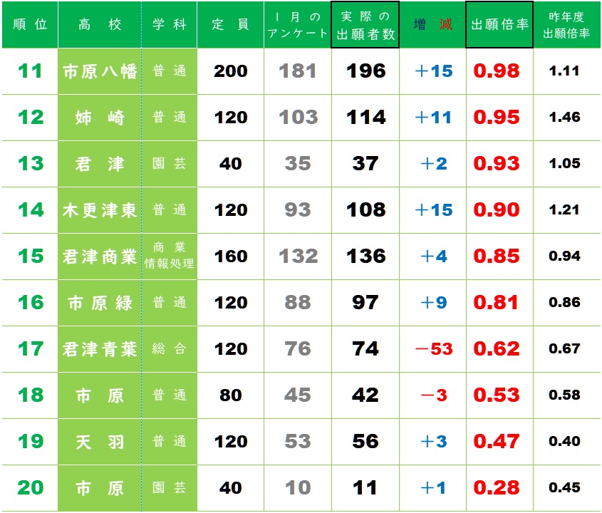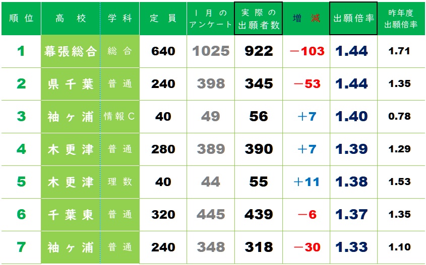 木更津普通科は隔年現象が強く出るところなので、1.5倍前後を覚悟していましたが、そこまでは戻らず。1月アンケートのデータ通りになりました。