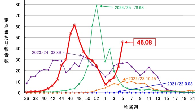 「インフルエンザ警報」の基準は 30件。