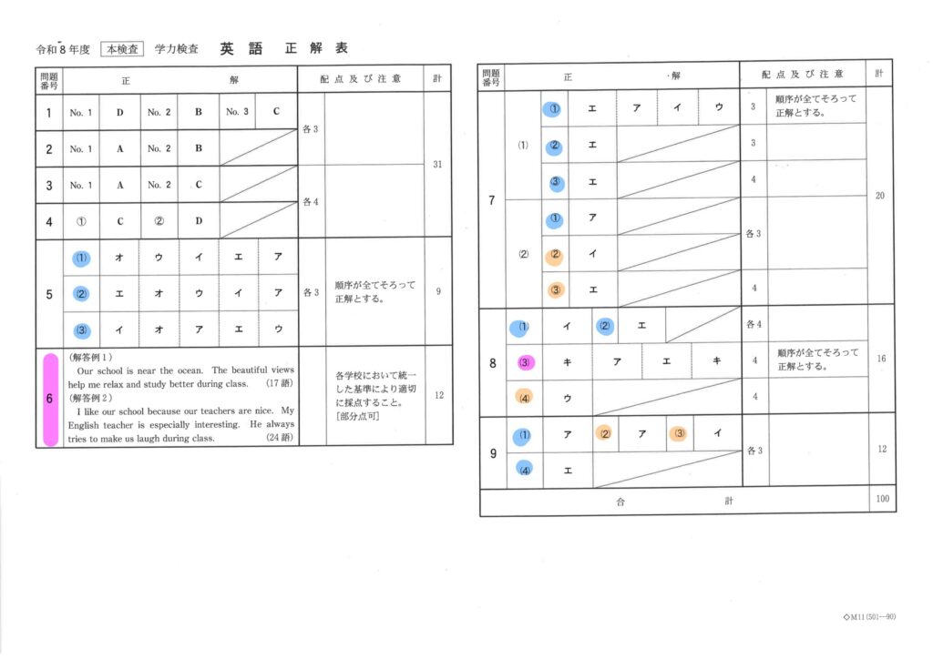 ・どちらも③に英問英答が出題された。「次の質問の応答文として適切なものを選びなさい」などといった日本語は一切なし。新傾向。面食らった受験生は少なくなかったはず。次年度の県内中学校の定期テストは、英問英答が必ず出題されることをここに予言する笑