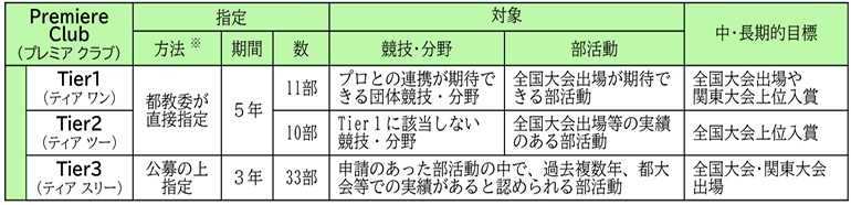 「スポーツ及び文化・芸術等の分野において、高い成果が期待できる部活動を『Premiere Club(プレミアクラブ)』として指定し、指定方法や支援内容に応じて、Tier1からTier3までの区分を設け、計画的・重点的な支援を行う」